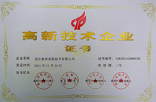 2012年3月6日,武漢奧邦表面技術(shù)有限公司接到湖北省科學(xué)技術(shù)廳、湖北省財(cái)政廳、湖北省國(guó)家稅務(wù)局、湖北省地方稅務(wù)局四家政府部門聯(lián)合發(fā)文的通知,通知中寫道:“根據(jù)《高新技術(shù)企業(yè)認(rèn)定管理辦法》及《高新技術(shù)企業(yè)認(rèn)定管理工作指引》有關(guān)規(guī)定,經(jīng)企業(yè)申報(bào)、省認(rèn)定辦審查、網(wǎng)上公示、公告?zhèn)浒傅瘸绦?,并?jīng)全國(guó)高新技術(shù)企業(yè)認(rèn)定管理工作領(lǐng)導(dǎo)小組辦公室回函確認(rèn),同意認(rèn)定武漢奧邦表面技術(shù)有限公司為高新技術(shù)企業(yè)。”